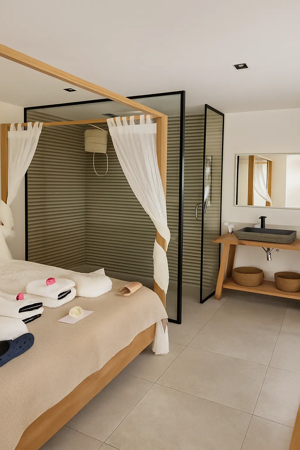 Une douche italienne en verre offre un accès de plain-pied, idéal pour le confort et l’accessibilité. Elle agrandit visuellement la salle de bain et apporte une touche élégante et moderne.